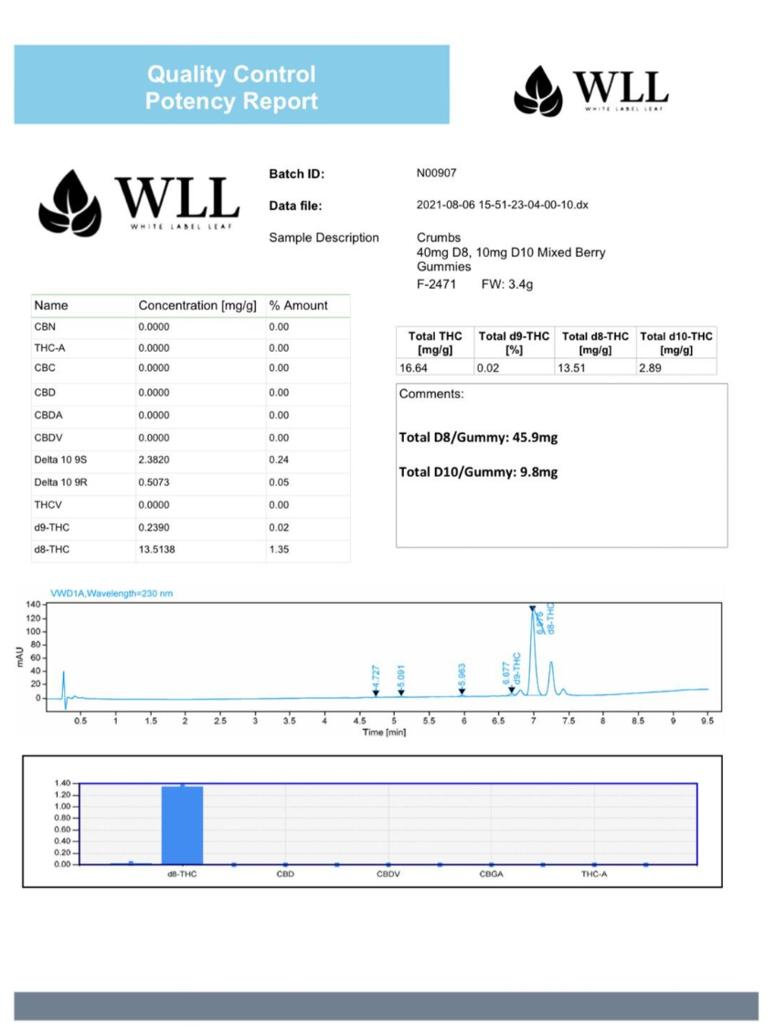 Crumbs by Flying Monkey D10 Gummies offer a delicious and potent way to experience the benefits of Delta-10 THC. Each pack contains 20 gummies, with a total of 1000mg of D10, delivering a mellow and uplifting effect that's perfect for daytime use. Known for its mild psychoactive properties, Delta-10 provides a smoother and less intense high compared to other cannabinoids, making it an excellent choice for those looking to relax and stay focused. These gummies are a great option for those seeking a discreet, flavorful, and easy-to-dose method of consumption.