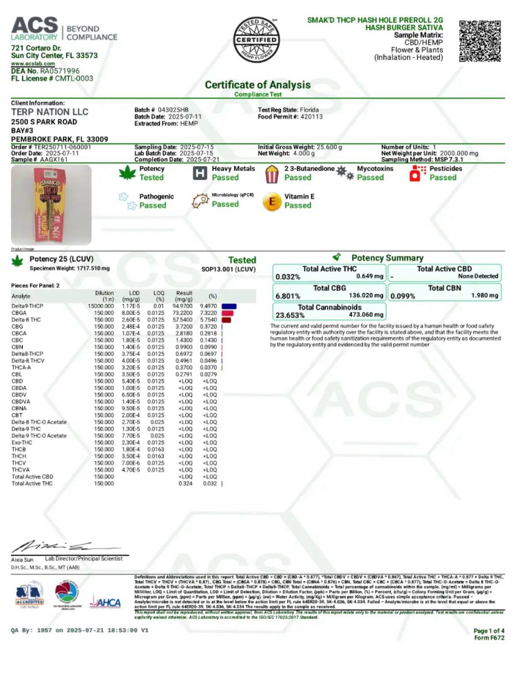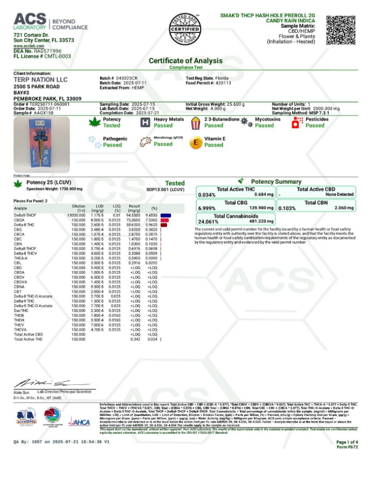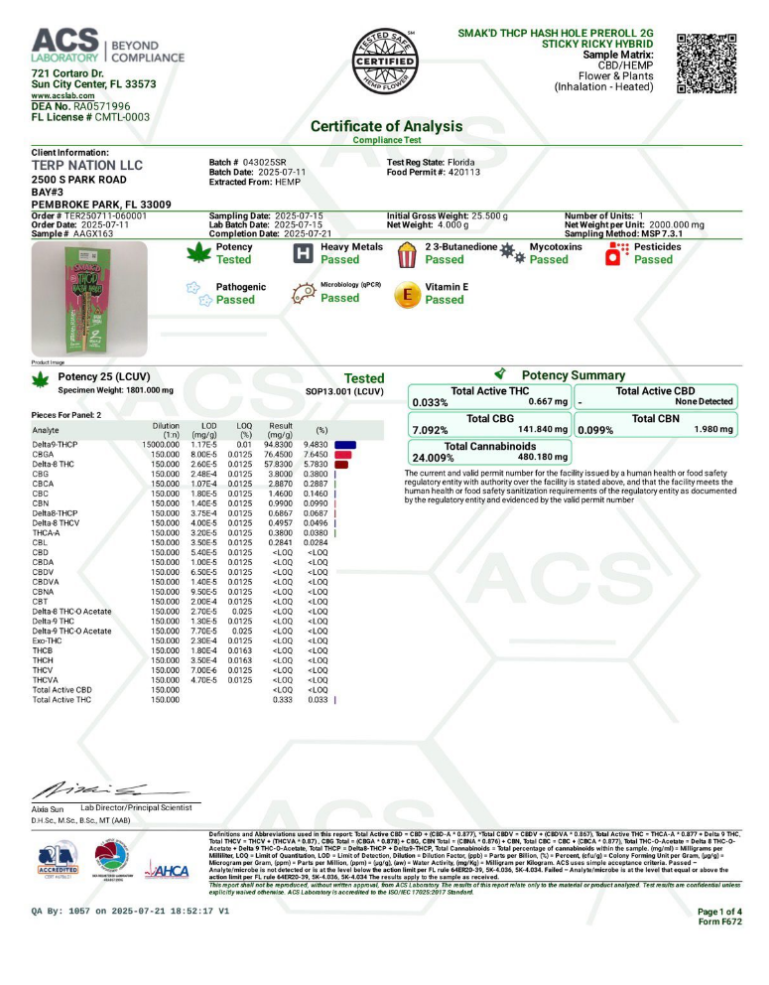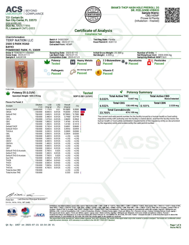 This product contains a total Delta-9 tetrahydrocannabinol concentration that does not exceed 0.3% on dry weight basis, in compliance with the 208 Farm Bill and Florida HB 1475.
